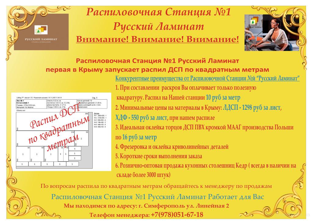 Наша Распиловочная Станция №1 "Русский Ламинат" предоставляет услуги по распилу и оклейки ДСП.
