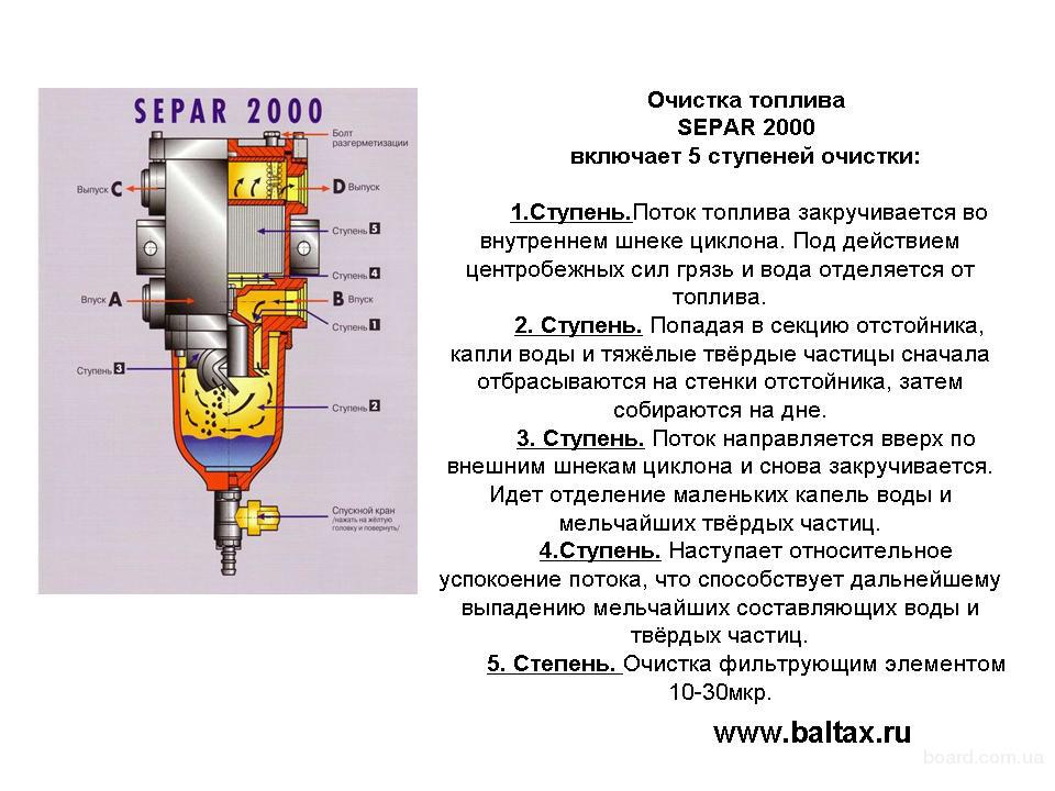 Separ-2000 – единственный в мире на сегодня топливный фильтр, позволяющий на 100% очистить топливо от частиц воды и на 96% от частиц грязи по DIN ISO 4020 при незначительном внутреннем сопротивлении. Затраты на ремонт ТНВД , форсунок достигают 20-30 000 рублей. Лучшее решение - сократить расходы – установить Separ-2000 на Ваш легковой или грузовой автомобиль, строительную технику, котельную, генератор или АЗС. Сепар-2000 - 100% очистка дизельного топлива от частиц воды грязи и парафина. Уже устанавливается на технику MAN John Deere Deutz MTU Volvo Penta FORD transit Mercedes sprinter и многие другие. Лучшие цены от официального представителя SEPAR FILTER в Санкт-Петербурге