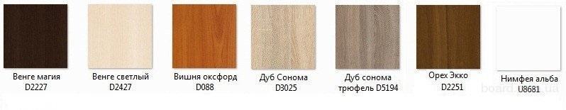 Можливі кольори ДСП: Венге магія, Венге світлий, Вишня оксфорд, Дуб сонома, Дуб сонома трюфель, Німфея альба, Горіх еко