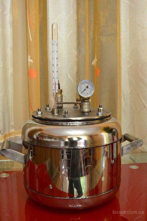Конструкция и комплектующие наших автоклавов изготовлены из нержавеющей стали и постоянно усовершенствуются. Мы используем термометры с металлической оправой и качественным манометром. Автоклавы из нержавейки от Николнерж сварены аргоном и испытаны — 8 атмосфер. Изначально накачивается 1 атмосфера. В процессе нагрева температура возростает до 110-120 градусов. Давление при этом поднимается до 2,5-2,8 атмосфер. Это рабочее давление автоклава.