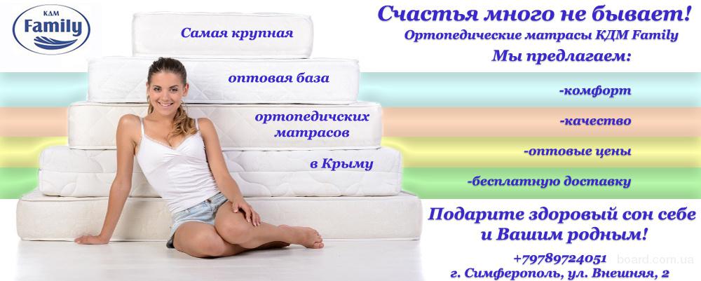 Уважаемые клиенты! Самая крупная оптовая база ортопедических матрасов КДМ Family в Крыму предоставляет Вашему вниманию: ортопедические, двухсторонние, пружинные и беспружинные. Товар отпускается от одной единицы по оптовым ценам, доставка по Крыму - БЕСПЛАТНО! Вся продукция имеется на складе в городе Симферополе.