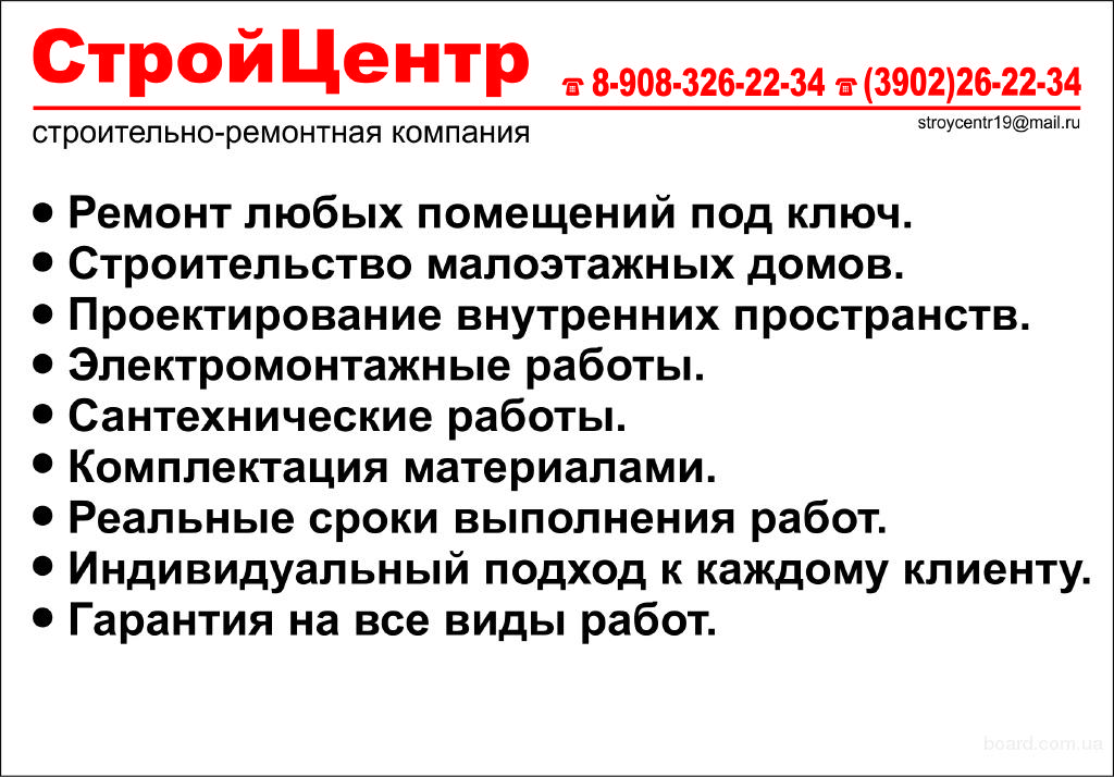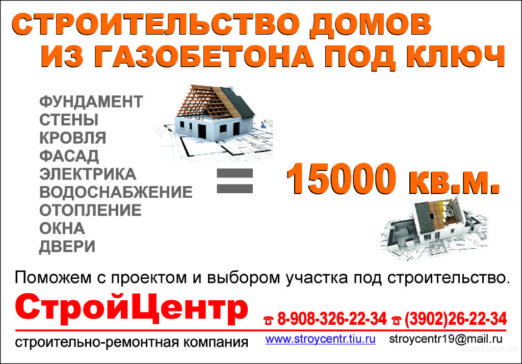 -Ремонт любых помещений под ключ -Строительство малоэтажных домов под ключ -Проектирование внутренних пространств -Электромонтажные работы -Сантехнические работы Строительство домов из газобетона под ключ 15000руб.м2 Поможем с проектом. Большой выбор участков под строительство .