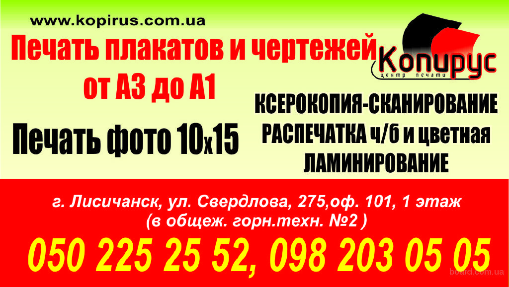 Рекламное агентство "Копирус". Луганская обл., г.Лисичанск, ул. Сосюры (бывш. Свердлова), 275, оф. 101, 1 этаж, общежитие горного техникума №2. т. 050 225 25 52, 098 203 05 05.
