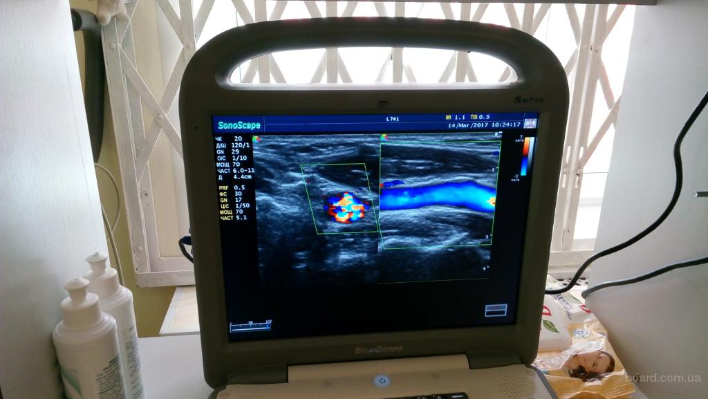 Аппарат УЗИ фирмы SonoScape S6Pro, портативный (возраст 3 года) с 4-мя датчиками (конвексный, линейный, фазированный для ЭХО, полостной). Приборная панель, монитор, гнезда для датчиков, сами датчики и их провода в идеальном состоянии. Провода в полиэтиленовых чехлах. Для каждого датчика есть пропоролоненный картонный оригинальный кейс. Прибор и датчики размещены в дорожных пропоролонненных сумках на колесиках, что удобно при транспортировке и желании оказывать услуги на выезде.