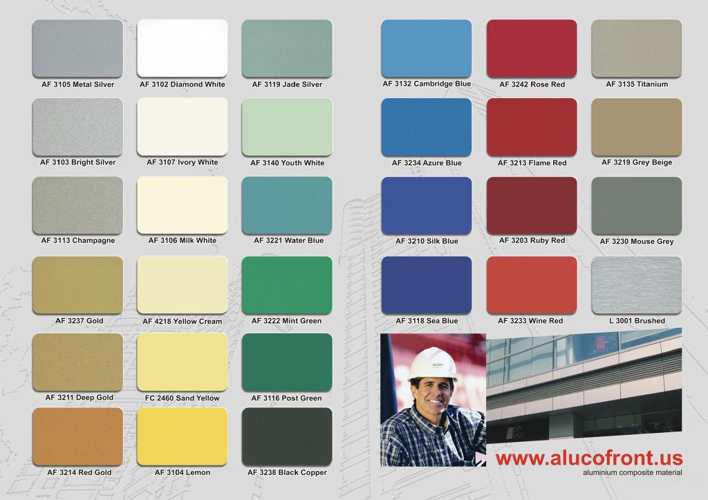 Предлагаем Вашему вниманию алюминиевые композитные панели Alucofront, толщиной 3,4,5 мм с тремя типами покрытия: (PE,PVDF,Durall-600) . Толщина алюминиевого слоя 0,21-0,5 мм Панели Alucofront В1 имеют украинское заключение соответствия по огнестойкости материалам группы Г1.. www.alucofront.us; www.megastroy.com.ua Высоцкая Людмила 8(050)464-45-25