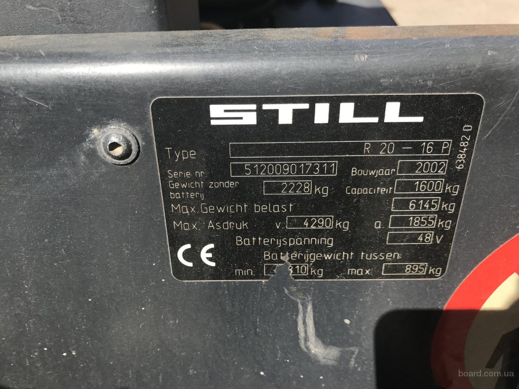 Still R20-16. Год выпуска 2002, грузоподъемность 1600 кг., высота подъема 5000 мм.,мачта триплекс, свободный ход, каретка бокового смещения, наработка ----- 1624 моточаса !.