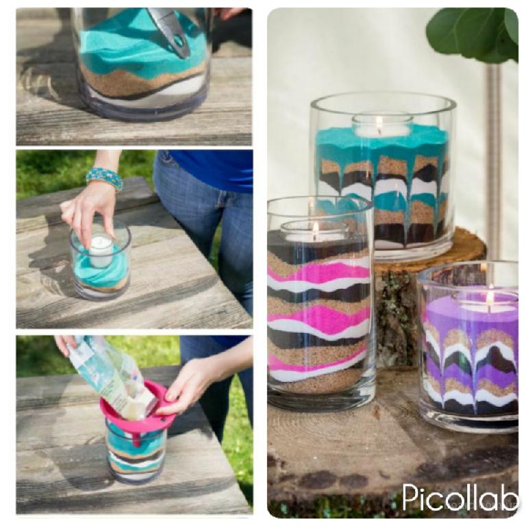 В последнее время считается модным  использование в декоре интерьера различных бутылок и баночек с разными наполнителями в том числе цветным песком (солью).