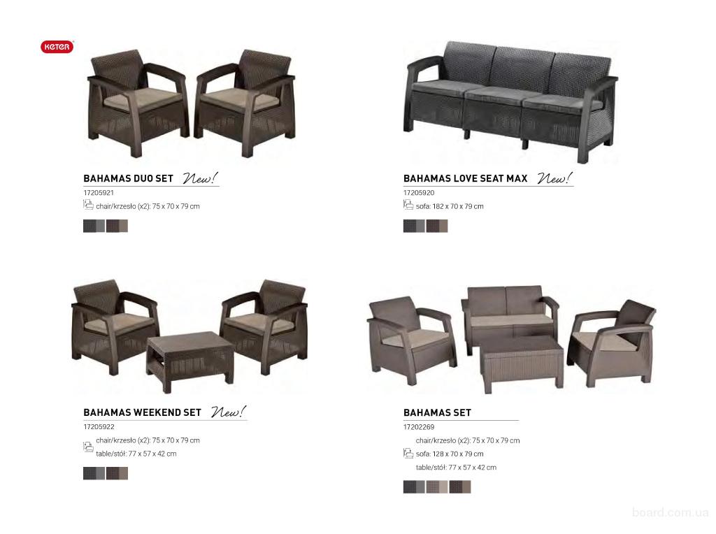 Элегантность, удобность, красота и функциональность в одном комплекте! Элитная садовая мебель от ведущего мирового производителя " Allibert, Keter " из Европы ( Голландия ). Мебель производится на европейских заводах с очень высокими стандартами и успешно служить несколько сезонов. Премиальное качество, неметаллическая рама, не ржавеет и не поддается гниению. Благодаря стойкому к высоким температурам материалу, цвет не выгорает и не тускнеет а также водонепроницаемый и могут стоять на улице при любой погоде целый год. Не смотря на то, что комплект выполнен из неметаллического каркаса, мебель устойчивая и прочная и без труда выдержит большой вес. Чехлы на подушках выполнены из плотной ткани, так же устойчивой к атмосферным явлениям. Мебель легкой и одновременно очень устойчивой конструкции очень просто содержать в чистоте.