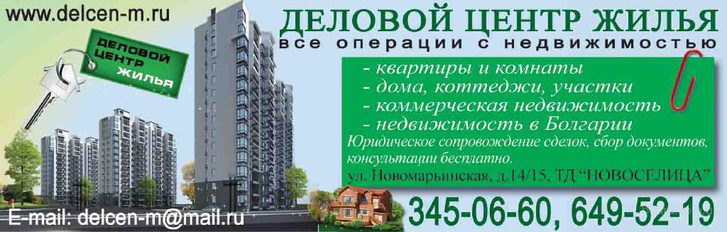 Деловой центр жилья ООО компания – на рынке 4 года. Все операции с недвижимостью. Квартиры, комнаты, дома, дачи, коттеджи, земельные участки любого назначения использования, элитная и зарубежная недвижимость, покупка, продажа, аренда. Работаем на рынке жилья Москвы и Московской области. У нас работают только опытные специалисты, имеющие большой опыт. Комиссия по договоренности с клиентом.