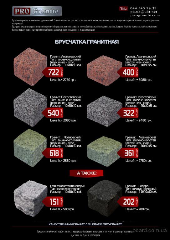 Реализуем продукцию из натурального камня:  полированная и термообработанная модульная плитка, плиты мощения, слябы, брусчатка, бордюры, лесницы, столешницы, колоны, скульптуры, фонтаны в соответствии к требованиям стандартов, вашим пожеланиям и по выгодным ценам! Тел.: 044-545-74-39 ,  095-177-70-03,  096-420-75-10 ,  http://pro-granite.com, e-mail : pk.ua@ukr.net