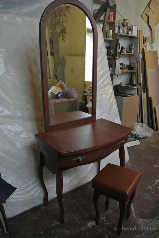 Туалетный столик производится из массива дерева ольхи, бука, ясеня, дуба. В бюро расположен широкий выдвижной ящик, под которым вместительная открытая полка. Размеры изделия в стандартном исполнении 800х500х1900 мм. Цвета тонировки дерева: белый, бежевый, слоновая кость, ольха, бук, груша, каштан, дуб, клён, махагон, вишня, орех, красное дерево, венге, а также индивидуальный подбор выкраски. Стоимость трюмо с зеркалом – 8000 грн. Пуф – 800 грн. Период поставки – 3 недели. Доставляется во все регионы.