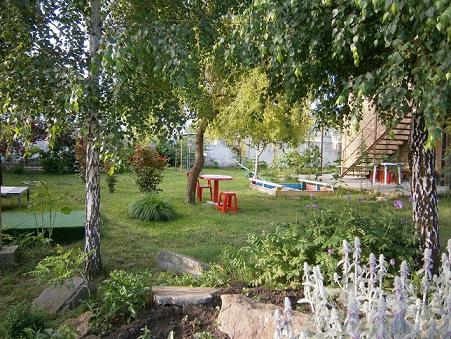 Отдых семейный дешевый тихий в пансионате "Роза ветров" у Черного моря в центре курорта Каролино-Бугаз Одесская область. Большой зеленый закрытый двор с беседками мангалами детской площадкой