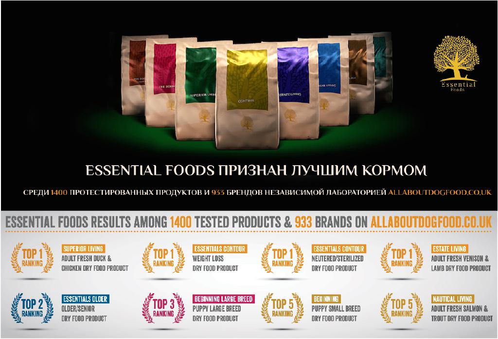 ESSENTIAL FOODS ПРИЗНАН ЛУЧШИМ КОРМОМ СРЕДИ 1400 ПРОТЕСТИРОВАННЫХ ПРОДУКТОВ И 933 БРЕНДОВ НЕЗАВИСИМОЙ ЛАБОРАТОРИЕЙ ALLABOUTDOGFOOD.CO.UK