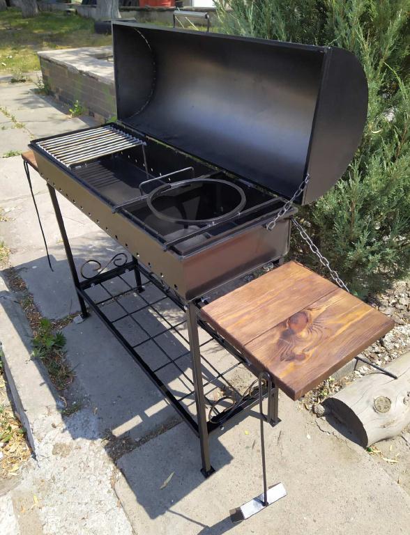 Мангал обварен по контуру усилительным ребром жёсткости. Долговечность и прочность мангала гарантируем. Дерево столешницы обработано морилкой и лаком.
