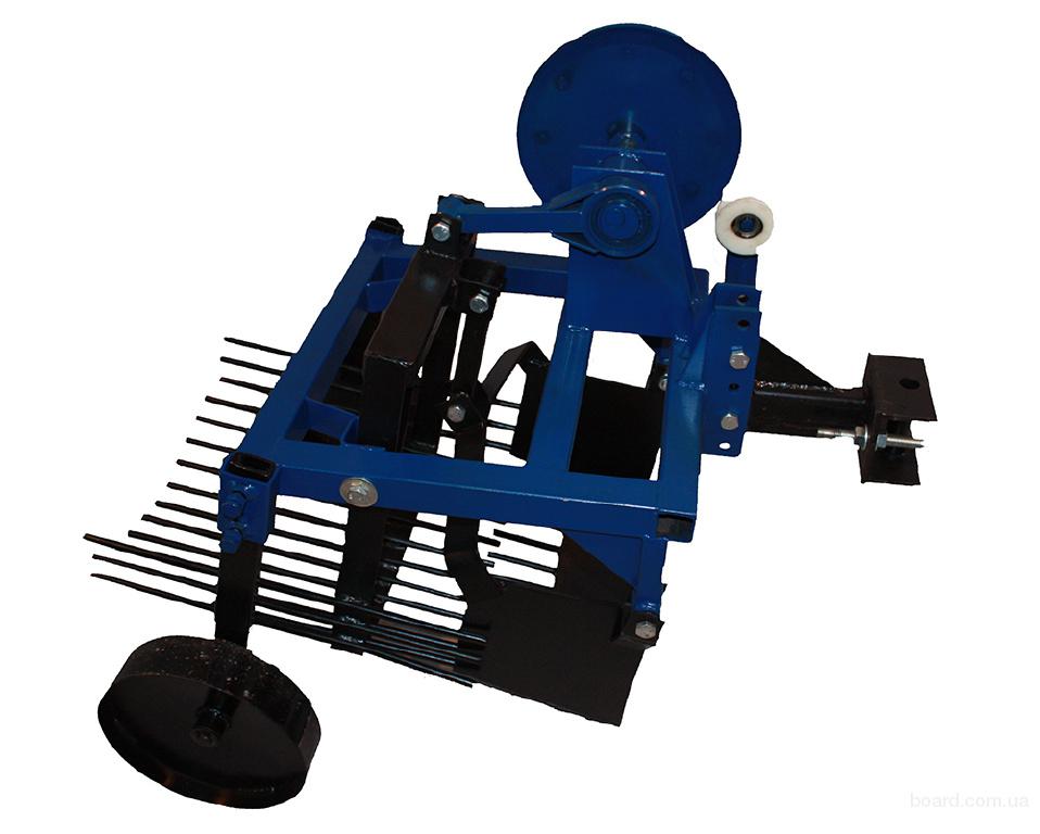 Картофелекопатель механический однорядный. Агрегатируется с мотоблоками. Предназначен для выкапывания картофеля, отделения клубней от земли и укладки на поверхность, после чего остается только вручную собрать выкопанные клубни. Также возможно выкапывание лука, чеснока.