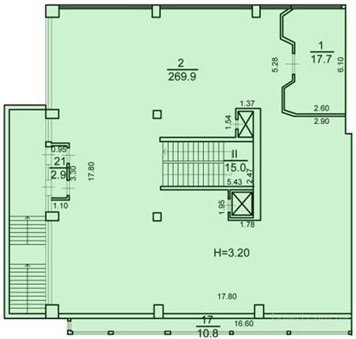 Магазин представляет собой двухэтажное строение с подвалом, встроенным в торец здания действующего бизнес-центра «Научный». Общая площадь - 842,2 кв.м. Первый этаж – 316,3 кв.м., второй этаж -298,5 кв.м..  Высота потолков –  3,2 м. Подвал площадью - 227,4 кв.м. С высотой потолков - 3 м. Душевые и раздевалки занимают часть подвала.