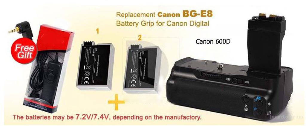 Продаю новый батарейный блок - аналог BG-E8 для фотоаппаратов Canon EOS 550D,Canon EOS 600D, + два аккумулятора LP-E8, + дистанционное управление. Работает на шести пальчиковых батареях ( AA ) или двух аккумуляторах LP-E8 (есть в комплекте). На рукоятке расположены : дополнительная спусковая кнопка затвора, кнопка АЕ lock/FE lock,кнопка автофокуса, и диск управления. В комплекте: батарейный блок, две кассеты для аккумуляторов, два аккумулятора LP-E8, дистанционное управление. Цена 650 гр. Т. 068-267-11-72; E-mail: ig51@mksat.net