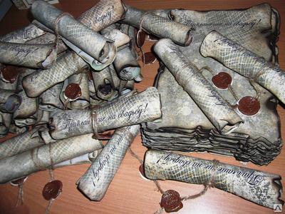 Новый вид необычных и оригинальных свадебных приглашений ручной работы - пригласительные свитки. Свитки печатаются на холсте то-есть на ткани , завязываются ленточками и опечатываются сургучной печатью. А так же Ваши пригласительные свитки можно подстарить, поджечь края, выразить (под цвет) золотом или медью.