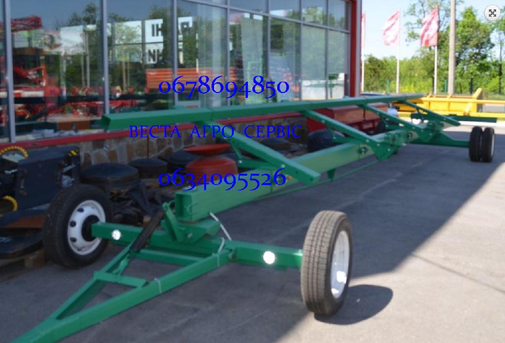 Тележки универсальные ЛАН предназначены для транспортировки зерновых, кукурузных, подсолнечниковых жаток непосредственно самим комбайном, оборудованным прицепным устройством. Целесообразно использование для перевозки жаток с шириной захвата от 7,32м до 12,5м.