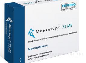 Менопур – это препарат человеческого менопаузного гонадотропина, получают его из мочи женщин в постменопаузе. Содержание действующих веществ в одном флаконе составляет 75 МЕ ФСГ (фолликулостимулирующий гормон) и 75 МЕ ЛГ (лютеинизирующий гормон).