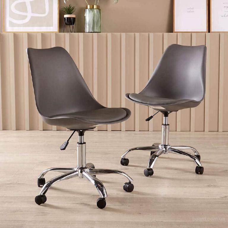 Кресло, регулируется по высоте с помощью газлифта, поворачивается, сиденье пластик полипропилен, мягкая подушка, экокожа, необрезиненные колеса, размер кресла: ширина 48 см, глубина 41 см, высота кресла от пола до сидения от 43 см до 56 см, высота спинки 42 см.
