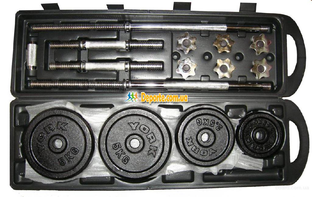 Набор York Fitness 50кг  - прекрасный атлетический комплект состоящий из штанги и двух гантелей, который позволит Вам заниматься в домашних условиях. При необходимости штанга разбирается и складывается в специальный футляр. Наборный механизм позволяет подобрать надлежащую нагрузку для различных видов жима как со штангой, так и с гантелями.